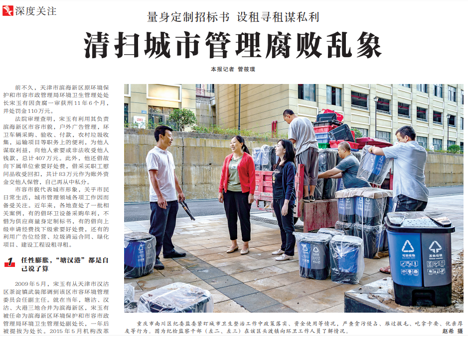 ●今天出版的中国纪检监察报深度关注栏目聚焦城市管理腐败乱象。文章对天津市滨海新区原环境保护和市容市政管理局环境卫生管理处处长宋玉、安徽省六安市叶集区(2016年2月前为叶集改革发展试验区)原城市管理行政执法局局长张斌等城市管理人员贪污受贿案进行了深入分析。