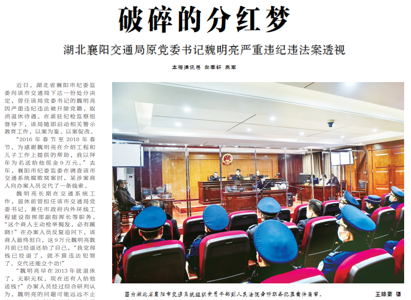 ●今天出版的中国纪检监察报以《破碎的分红梦》为题,深度剖析湖北省襄阳市交通局原党委书记魏明亮严重违纪违法案。