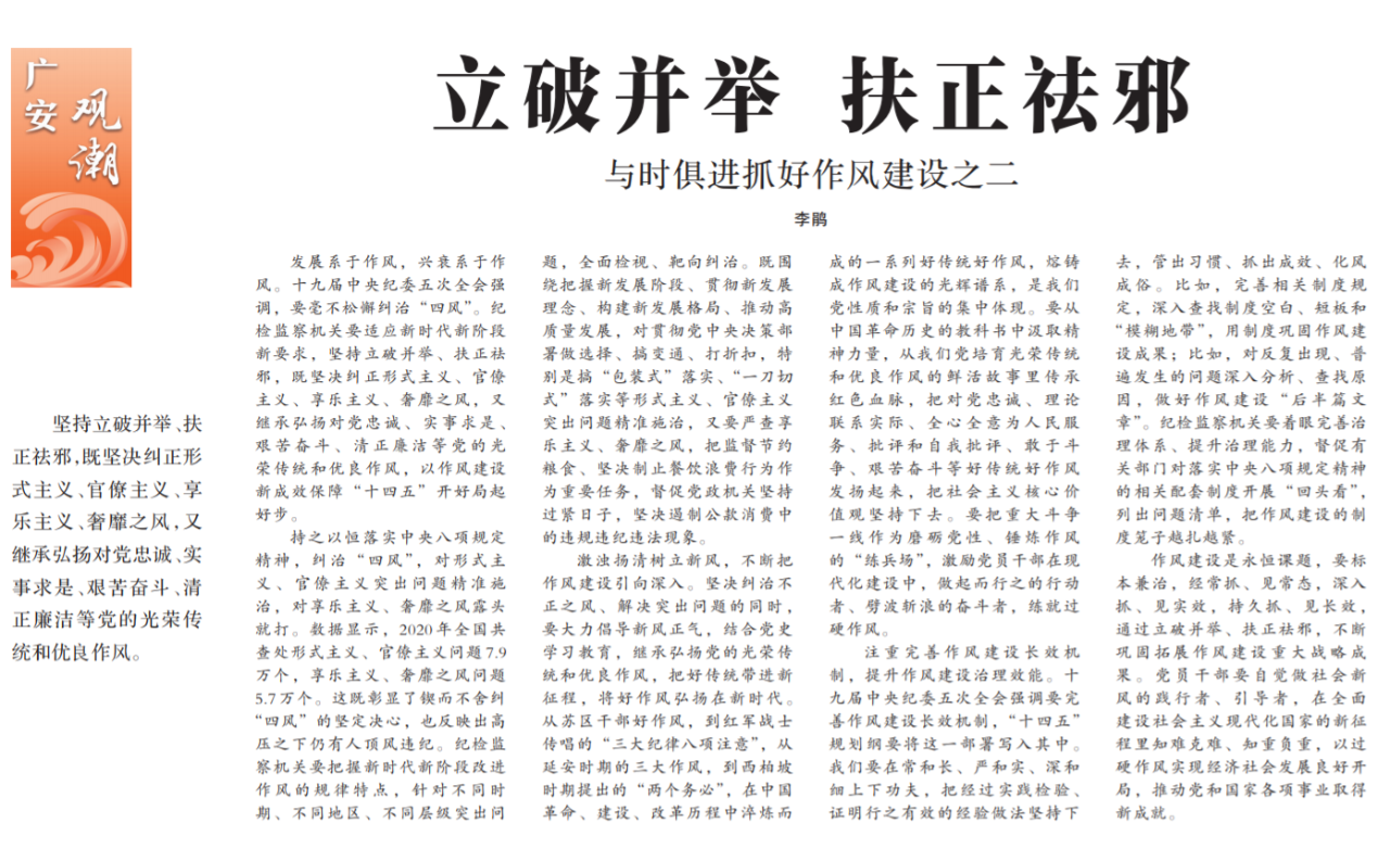 ●今天出版的中国纪检监察报广安观潮专栏发表“与时俱进抓好作风建设”系列评论之二《立破并举 扶正祛邪》。评论指出:纪检监察机关要坚持立破并举、扶正祛邪,既坚决纠正形式主义、官僚主义、享乐主义、奢靡之风,又继承弘扬对党忠诚、实事求是、艰苦奋斗、清正廉洁等党的光荣传统和优良作风。