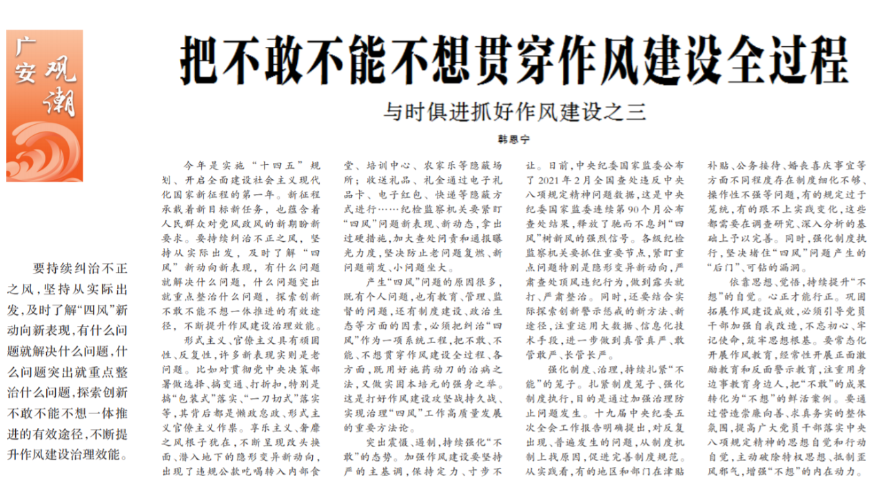 ●今天出版的中国纪检监察报广安观潮专栏发表“与时俱进抓好作风建设”系列评论之三《把不敢不能不想贯穿作风建设全过程》。评论指出:纪检监察机关要紧盯“四风”问题新表现、新动态,拿出过硬措施,加大查处问责和通报曝光力度,坚决防止老问题复燃、新问题萌发、小问题坐大。