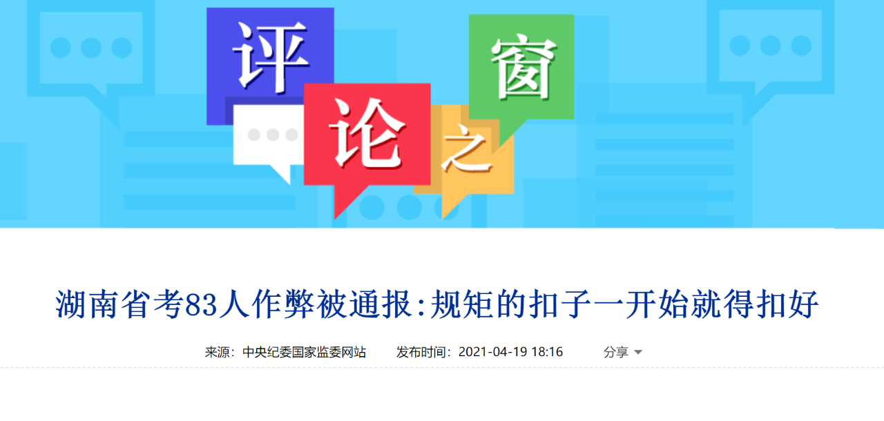 ●湖南省人事考试院18日通报:湖南省2021年公务员录用考试笔试中,83人因作弊被依规处理。中央纪委国家监委网站19日就此发表评论指出:公务员考试选拔的是履行公职、为人民服务的公职人员,是进入公务员队伍的第一关。如果在这样的考试中都不遵守规矩,违纪违规,那么谈何在将来行使公权力时能秉公用权、廉洁从政?