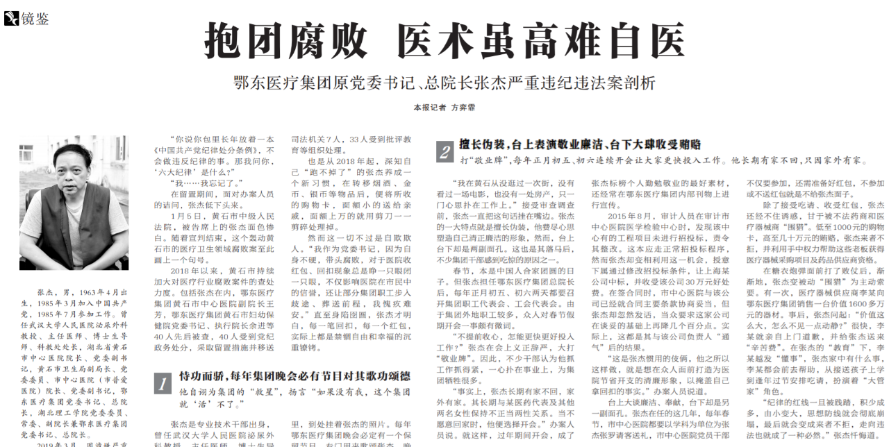 ●今天出版的中国纪检监察报以《抱团腐败 医术虽高难自医》为题,剖析鄂东医疗集团原党委书记、总院长张杰严重违纪违法案。