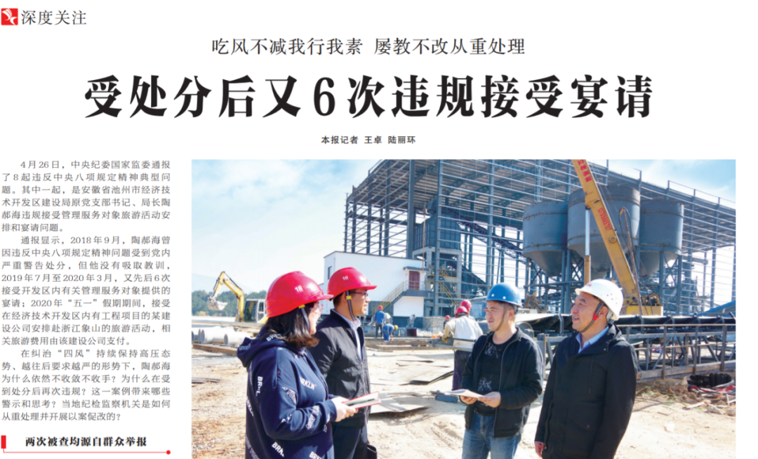 ●4月26日,池州市经济技术开发区建设局原党支部书记、局长陶郝海因违规接受管理服务对象旅游活动安排和宴请问题被中央纪委国家监委通报。2018年9月,陶郝海曾因违反中央八项规定精神问题受到党内严重警告处分,其后他又6次违规接受宴请。今天出版的中国纪检监察报深度关注专栏报道了当地纪检监察机关对其从重处理并开展以案促改的相关情况。