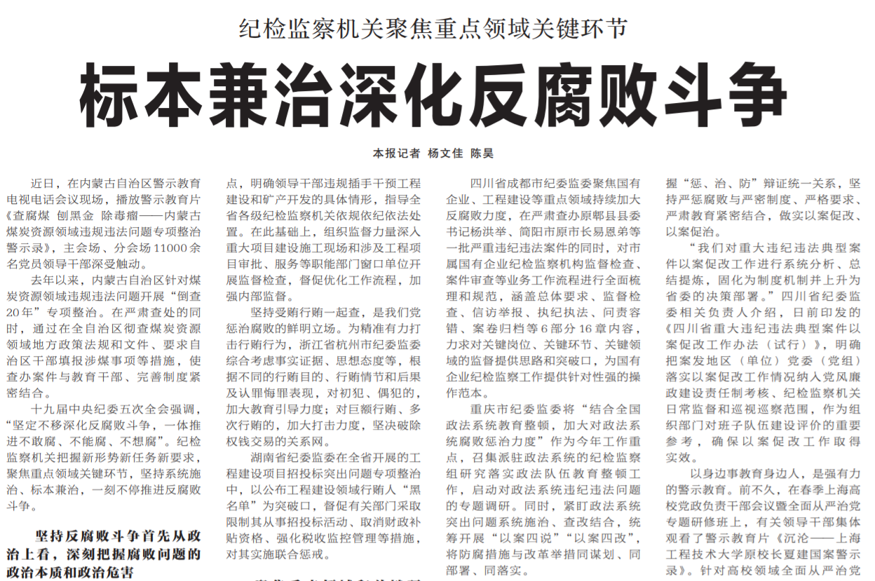 ●今天出版的中国纪检监察报头版头条报道了各级纪检监察机关把握新形势新任务新要求,聚焦重点领域关键环节,坚持系统施治、标本兼治,一刻不停推进反腐败斗争的相关情况。