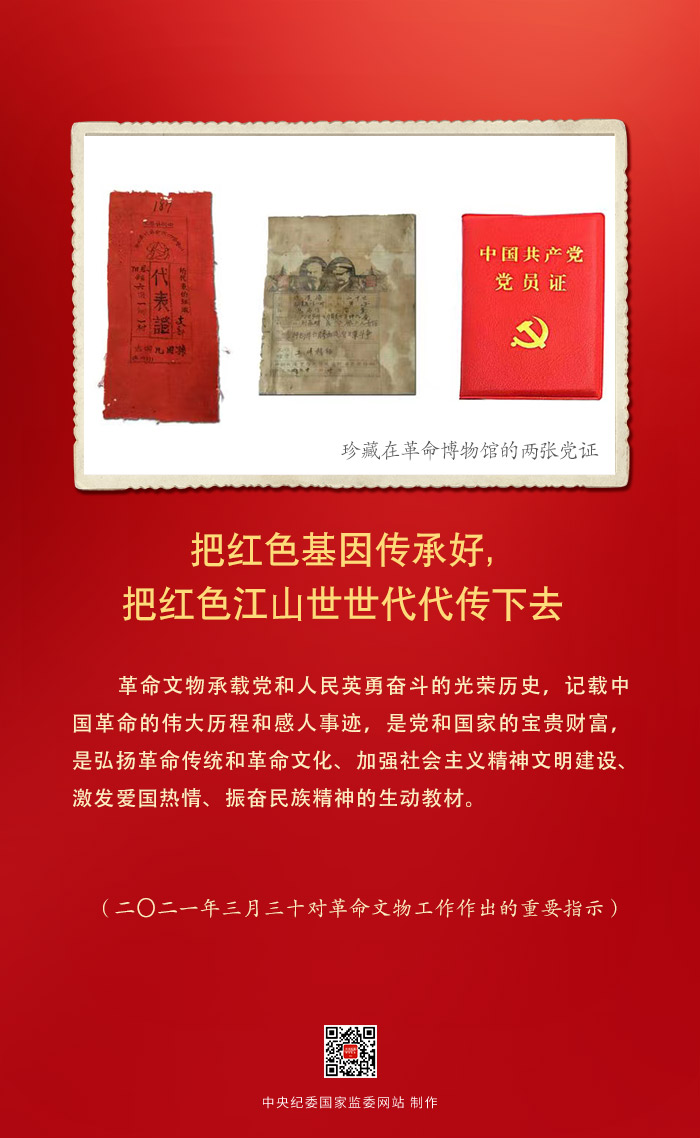 不同的党证,共同的使命。先辈们用鲜血和生命书写了对党和人民的无限忠诚,承载着中国共产党人的初心使命,时刻提醒着后世一定要传承和发扬光荣的革命传统,保持本真本心本色,努力践行社会主义核心价值观,厚植家国情怀,才能实现中华民族伟大复兴中国梦的理想抱负。(中央纪委国家监委网站 荆培轩 文字 王婵 设计)