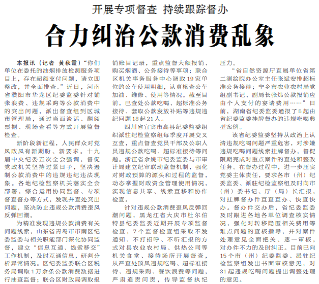 ●今天出版的中国纪检监察报头版报道了各地纪检监察机关落实全会部署,综合运用协同监督、专项督查督办等方式,发现并查处突出问题,坚决防止违规公款消费歪风反弹回潮。