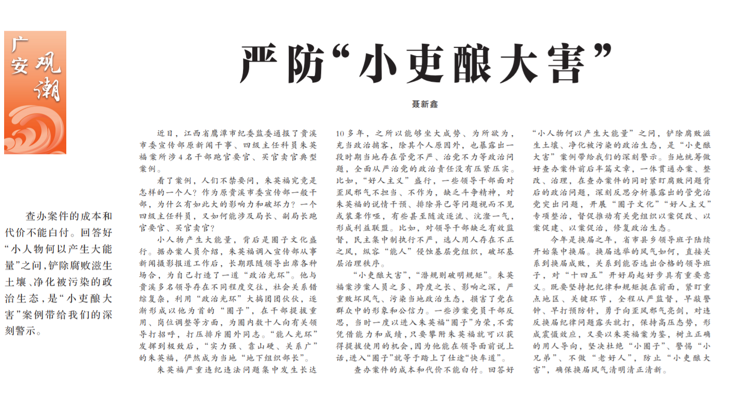 ●今天出版的中国纪检监察报广安观潮专栏发表评论《严防“小吏酿大害”》,以江西省原贵溪市委宣传部一般干部朱英福跑官要官、买官卖官案为例指出:要以朱英福案为鉴,树立正确的用人导向,坚决杜绝“小圈子”、警惕“小兄弟”、不做“老好人”,防止“小吏酿大害”,确保换届风气清明清正清新。