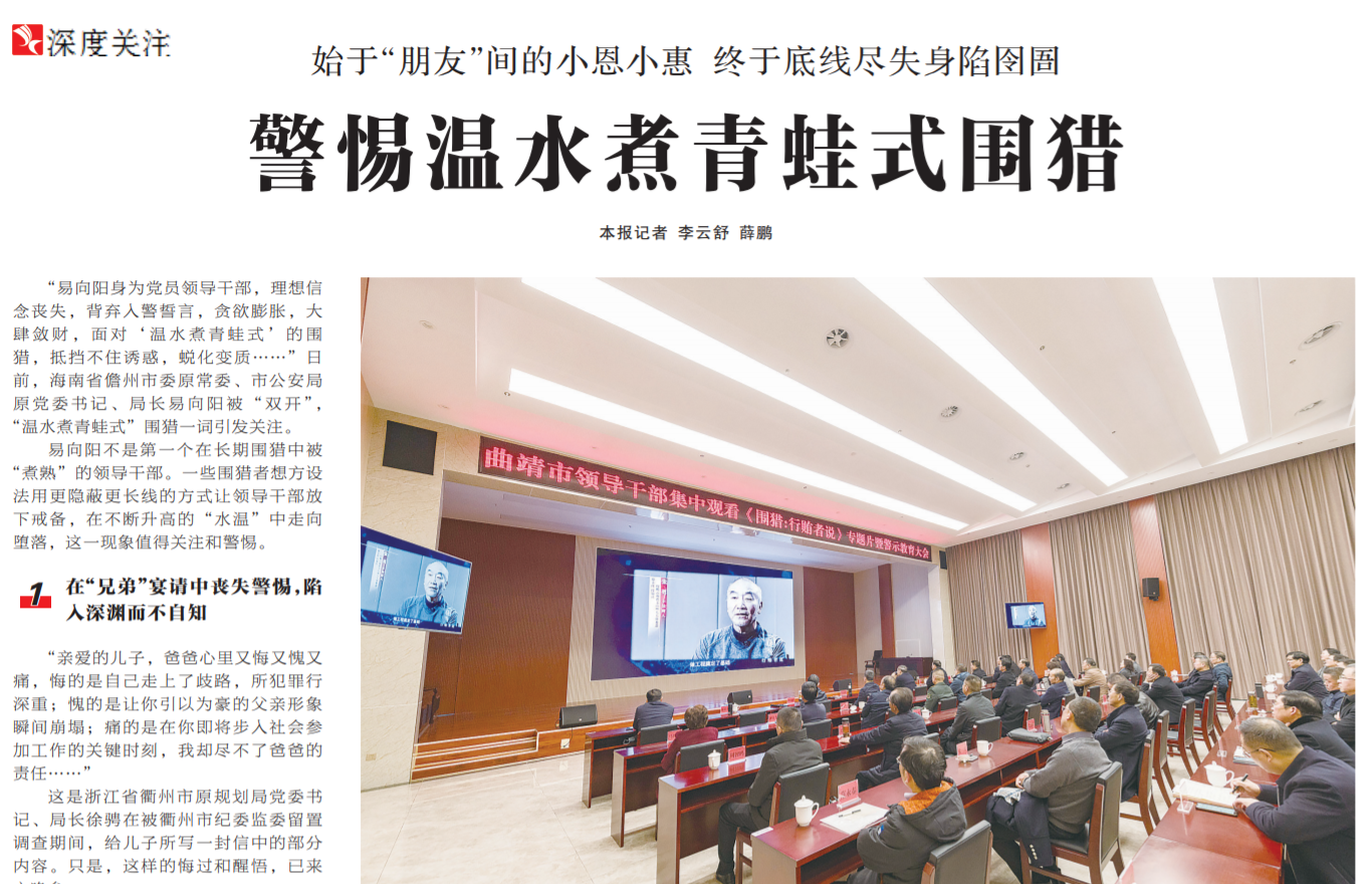 ● 今天出版的中国纪检监察报深度关注专栏以《警惕温水煮青蛙式围猎》为题报道指出:一些围猎者想方设法用更隐蔽更长线的方式让领导干部放下戒备,在不断升高的“水温”中走向堕落,这一现象值得关注和警惕。