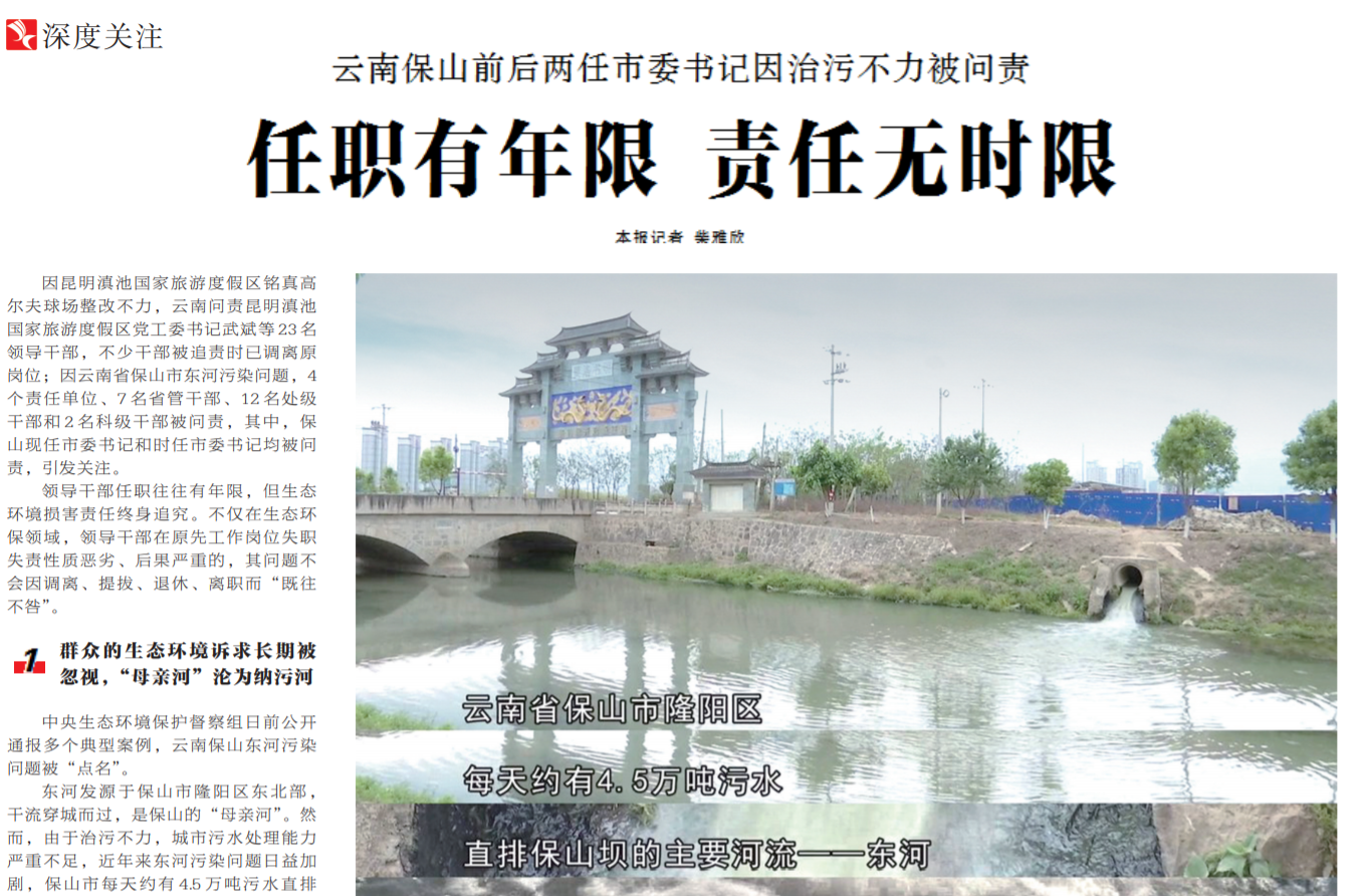 ●云南保山前后两任市委书记因治污不力被问责引发关注。今天出版的中国纪检监察报深度关注专栏以《任职有年限 责任无时限》为题报道指出:不仅在生态环保领域,领导干部在原先工作岗位失职失责性质恶劣、后果严重的,其问题不会因调离、提拔、退休、离职而“既往不咎”。