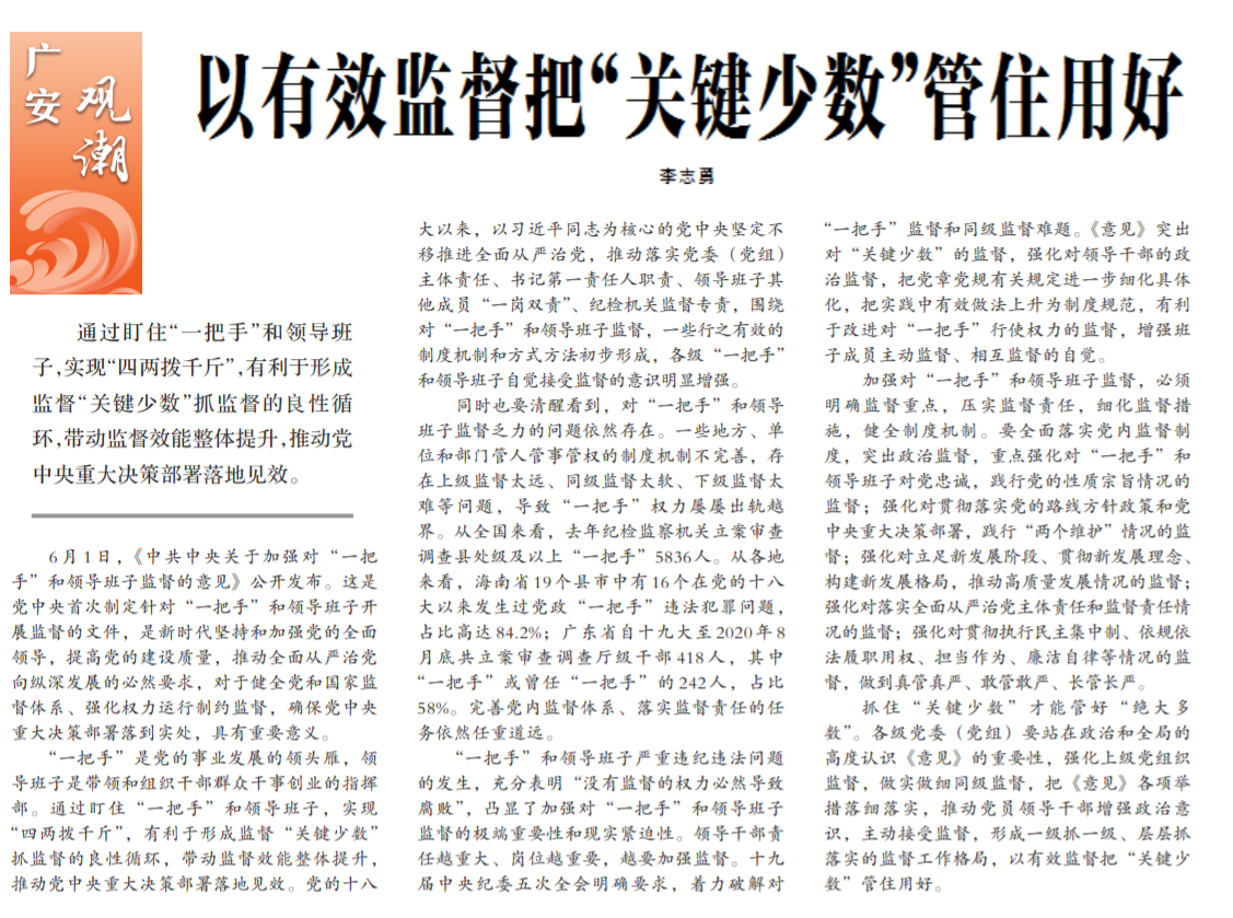 ● 今天出版的中国纪检监察报广安观潮专栏发表评论《以有效监督把“关键少数”管住用好》。评论指出:各级党委(党组)要站在政治和全局的高度认识《意见》的重要性,强化上级党组织监督,做实做细同级监督,把《意见》各项举措落细落实。