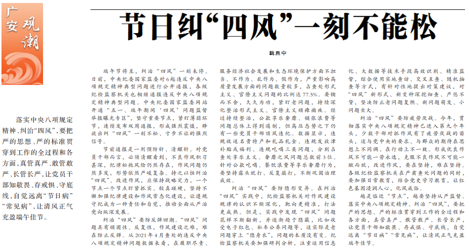 ●今天出版的中国纪检监察报广安观潮栏目发表评论《节日纠“四风”一刻不能松》。文章指出:越是临近“节点”,越要坚持从严监督。落实中央八项规定精神、纠治“四风”,要把严的思想、严的标准贯穿到工作的全过程和各方面,真管真严、敢管敢严、长管长严,让党员干部知敬畏、存戒惧、守底线,自觉远离“节日病”“常见病”,让清风正气充盈端午佳节。