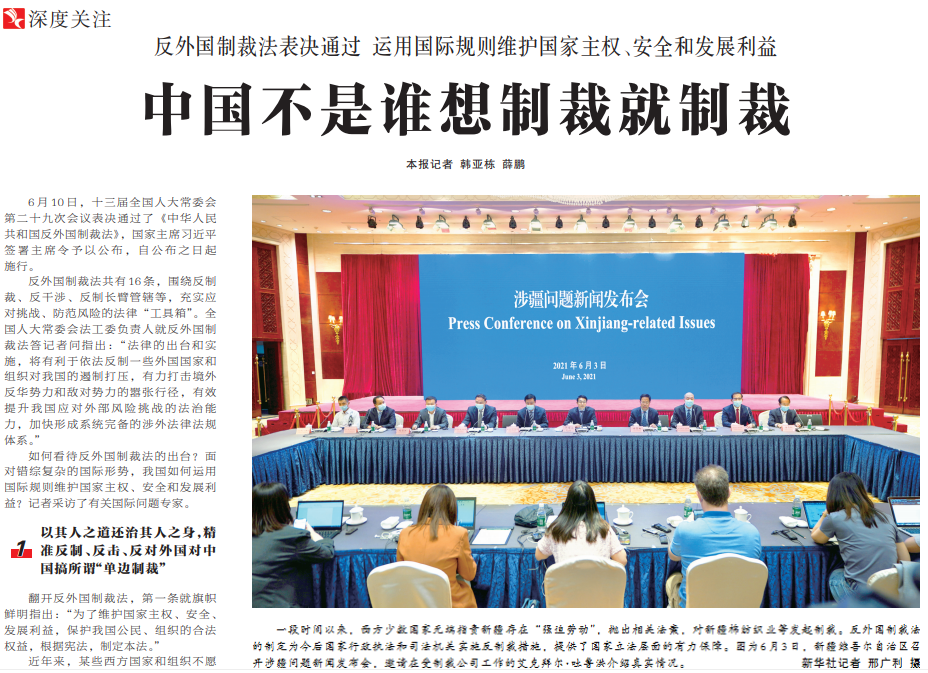 ●今天出版的中国纪检监察报深度关注栏目聚焦新发布的《中华人民共和国反外国制裁法》。文章指出:法律的出台和实施,将有利于依法反制一些外国国家和组织对我国的遏制打压,有力打击境外反华势力和敌对势力的嚣张行径,有效提升我国应对外部风险挑战的法治能力,加快形成系统完备的涉外法律法规体系。