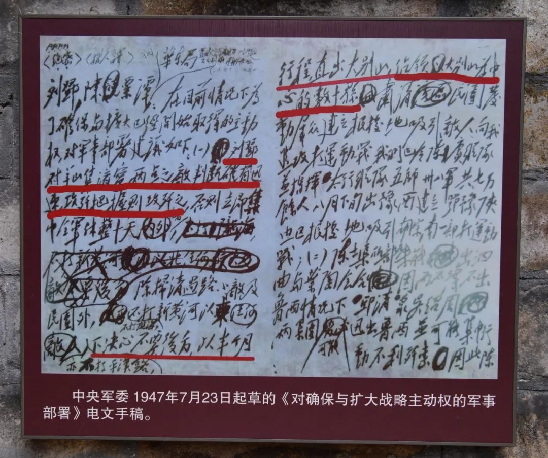 中央军委1947年7月23日指示刘邓大军直出大别山的电文手稿。
