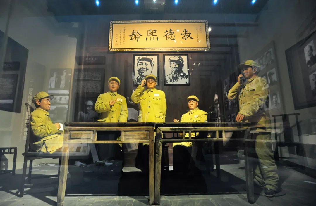 合肥渡江战役纪念馆内用蜡像制作的五位总前委在肥东瑶岗开会的场景。