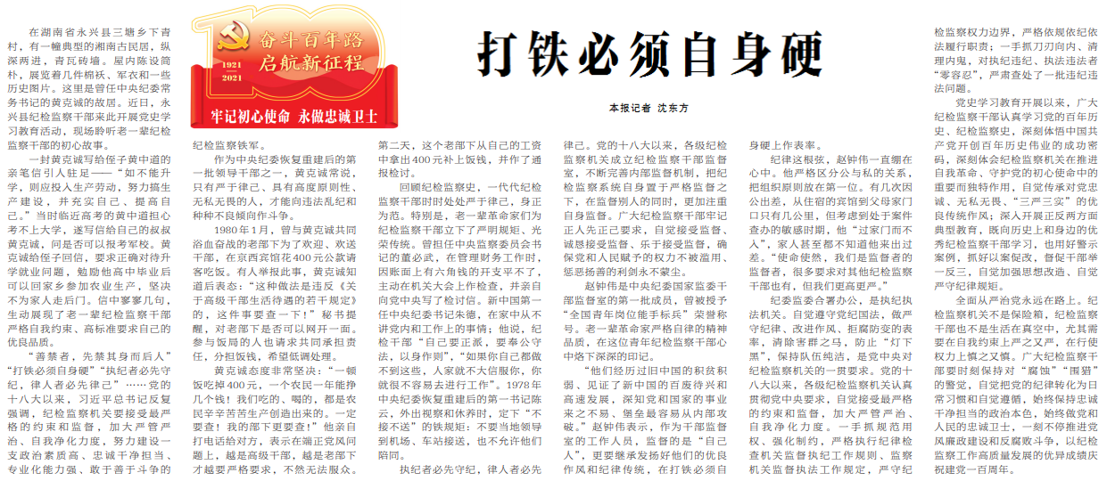 ●今天出版的中国纪检监察报头版发表报道《打铁必须自身硬》。文章指出:广大纪检监察干部牢记正人先正己要求,自觉接受监督、诚恳接受监督、乐于接受监督,确保党和人民赋予的权力不被滥用、惩恶扬善的利剑永不蒙尘。