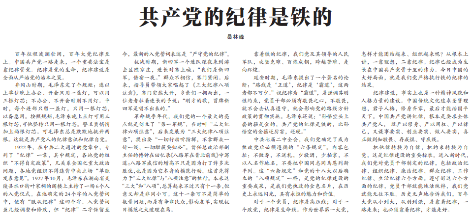 ●今天出版的中国纪检监察报发表评论《共产党的纪律是铁的》。文章指出:中国共产党一路走来,一个重要法宝是靠纪律管党。纪律是党的生命,纪律建设是全面从严治党的治本之策。