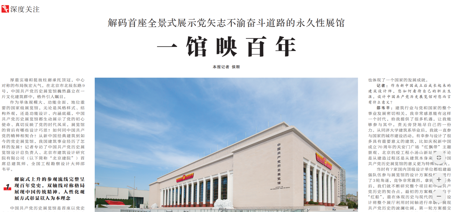 ● 今天出版的中国纪检监察报深度关注专栏以《一馆映百年》为题,专访中国共产党历史展览馆设计总负责人邵韦平,解码这座全景式展示党矢志不渝奋斗道路的永久性展馆。