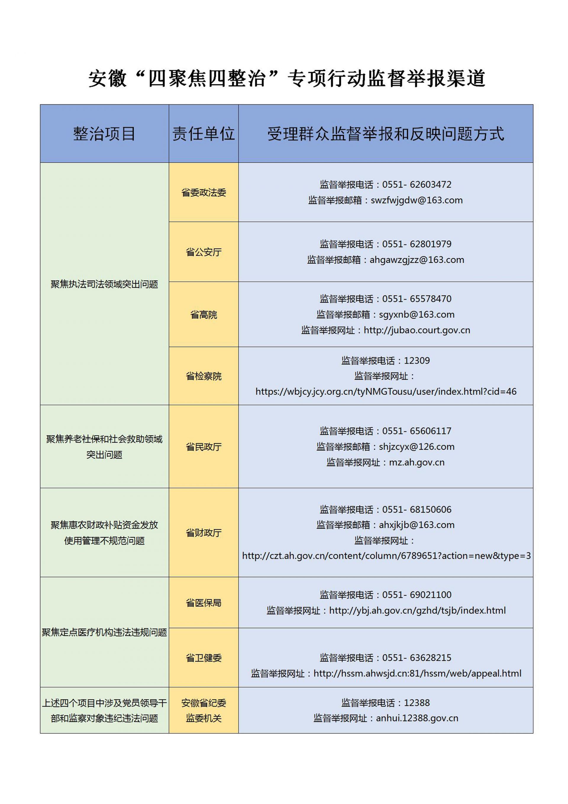 为认真贯彻落实中央纪委“更加突出整治群众身边腐败和作风问题”部署要求,今年以来,安徽省纪委监委结合中央巡视反馈意见整改和党史学习教育“我为群众办实事”实践活动,会同省委政法委、省民政厅、省财政厅、省医保局、省卫健委等部门,聚焦执法司法、养老社保、惠农财政补贴资金、医疗医保等4个重点领域突出问题,在全省开展“四聚焦四整治”专项行动,切实解决群众的操心事、烦心事、揪心事。
