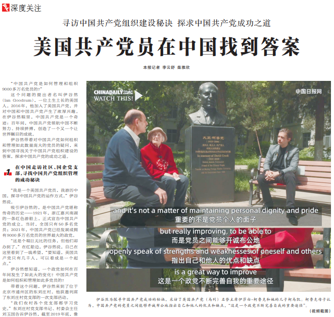 ●今天出版的中国纪检监察报深度关注专栏以《美国共产党员在中国找到答案》为题,报道了一名美国共产党员伊谷然带着对中国共产党如何组织和管理如此数量庞大的党员的疑问,来到中国寻找关于中国共产党组织建设的答案,探求中国共产党的成功之道。