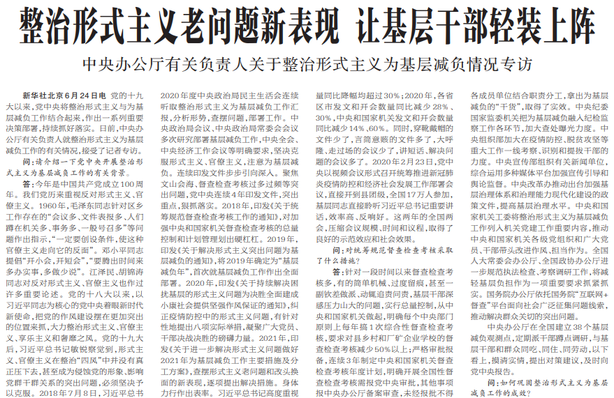 ●党的十九大以来,党中央将整治形式主义与为基层减负工作结合起来,作出一系列重要决策部署,持续抓好落实。日前,中央办公厅有关负责人就整治形式主义为基层减负工作的有关情况,接受了记者专访。