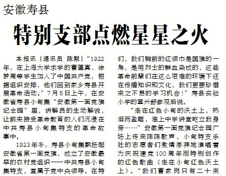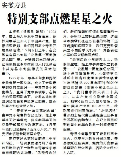 ●今天出版的中国纪检监察报报道了寿县小甸集“安徽第一面党旗纪念园”。据悉,寿县小甸集孕育了安徽的革命星火,党史学习教育开展以来,寿县依托红色资源,把党的历史鲜活地呈现在群众面前,活动受众近60万人次。