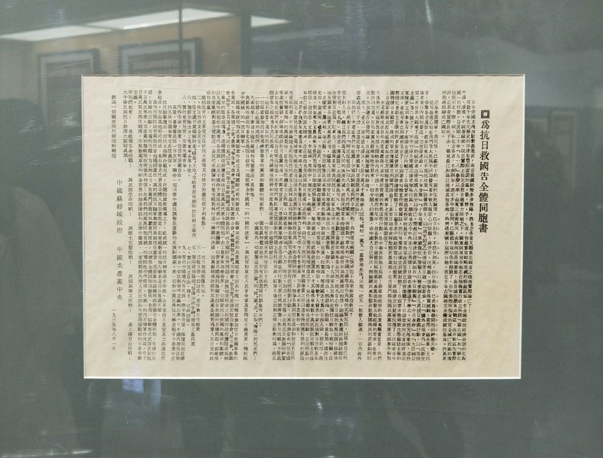 不远处,《中国苏维埃政府、中国共产党中央为抗日救国告全体同胞书》(“八一宣言”)复制件吸引观众驻足观看。 1935年8月,中国共产党起草了著名的“八一宣言”,呼吁全国各党派、各军队、各界同胞停止内战,集中一切国力为抗日而奋斗。