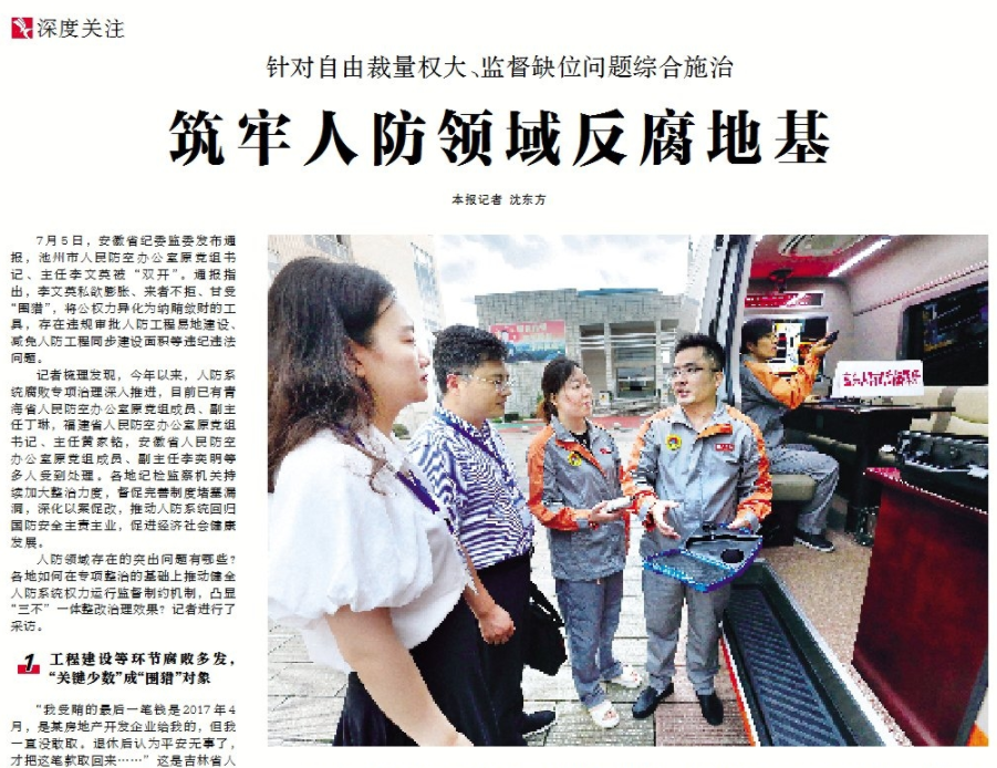 ●今天出版的中国纪检监察报深度关注栏目以《筑牢人防领域反腐地基》为题,聚焦人防系统腐败治理。文中对安徽省如何推进人防系统腐败问题专项治理工作进行了报道。