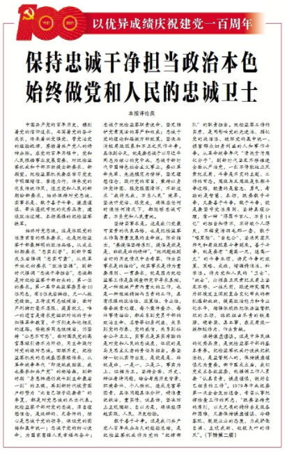 ●今天出版的中国纪检监察报头版发表评论员文章《保持忠诚干净担当政治本色 始终做党和人民的忠诚卫士》。文章指出,纪检监察机关要始终保持对党忠诚、实事求是、敢于善于斗争、谦虚谨慎、带头遵规守纪的优秀品质,建设政治过硬、本领高强的纪检监察铁军。