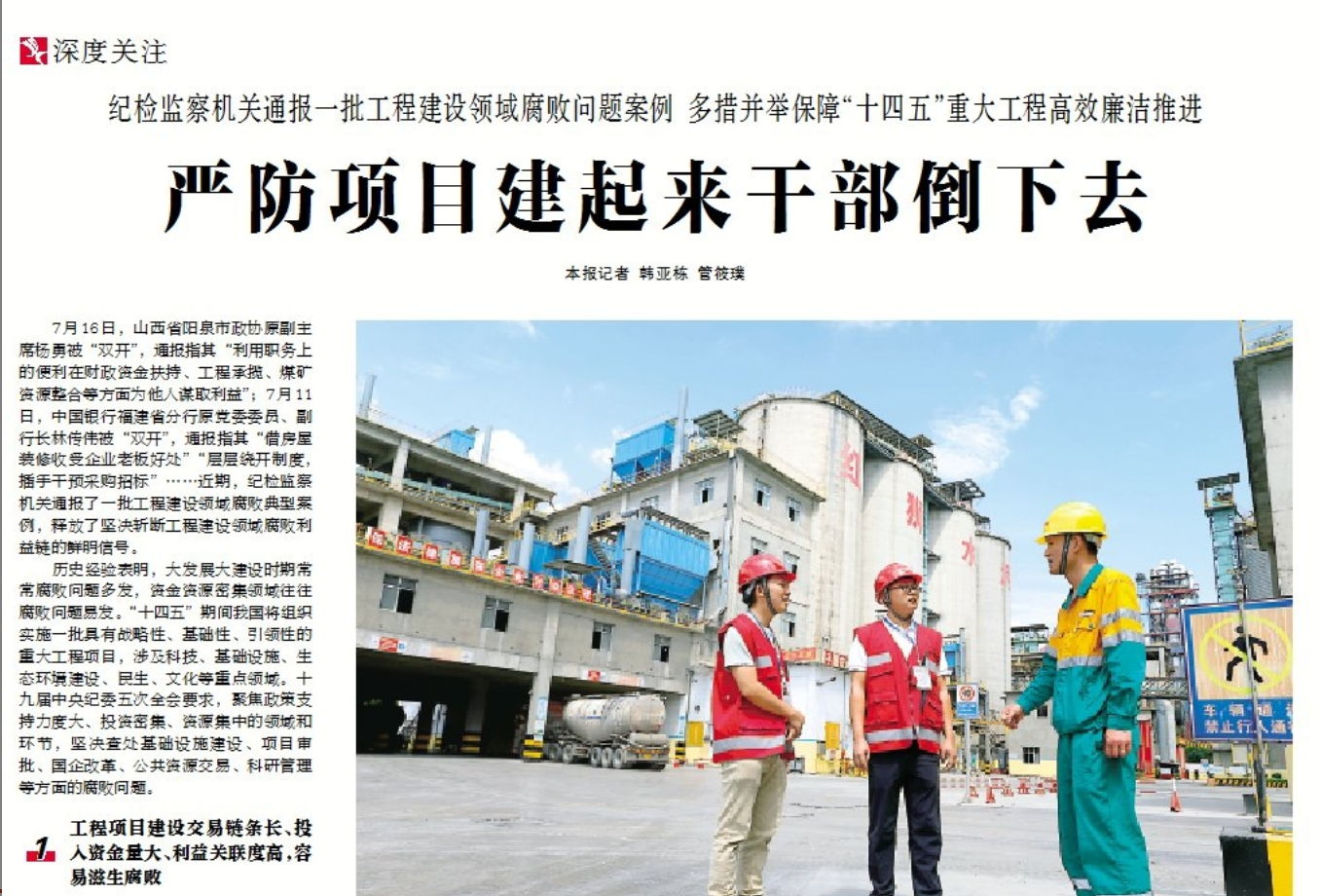 ● 近期,纪检监察机关通报了一批工程建设领域腐败典型案例,释放了坚决斩断工程建设领域腐败利益链的鲜明信号。今天出版的中国纪检监察报深度关注专栏以《严防项目建起来干部倒下去》为题,报道了纪检监察机关聚焦政策支持力度大、投资密集、资源集中的领域和环节,坚决查处基础设施建设、项目审批、国企改革、公共资源交易、科研管理等方面腐败问题的相关举措。