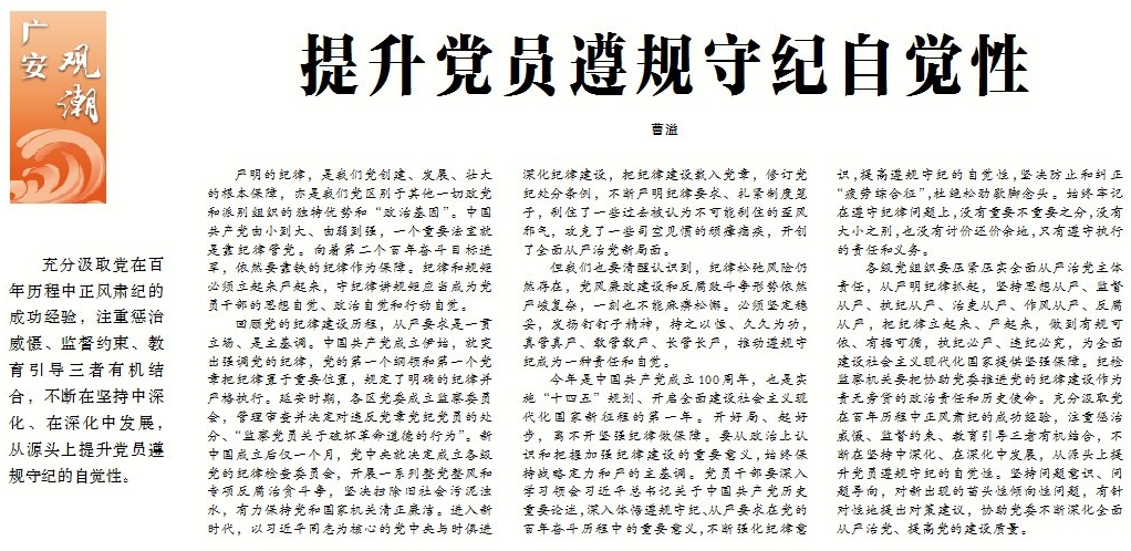 ●今天出版的中国纪检监察报广安观潮栏目发表评论《提升党员遵规守纪自觉性》。文章指出:向着第二个百年奋斗目标进军,依然要靠铁的纪律作为保障。纪律和规矩必须立起来严起来,守纪律讲规矩应当成为党员干部的思想自觉、政治自觉和行动自觉。