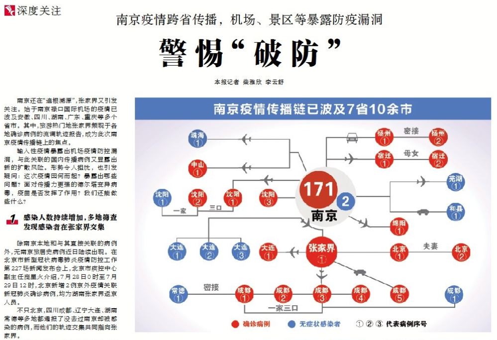 ●今天出版的中国纪检监察报深度关注栏目以《警惕“破防”》为题,聚焦南京本轮疫情,就疫情因何而起、暴露出哪些问题、面对传播力更强的德尔塔变异病毒,疫苗是否发挥了作用等一系列问题,邀请有关专家进行了解读。