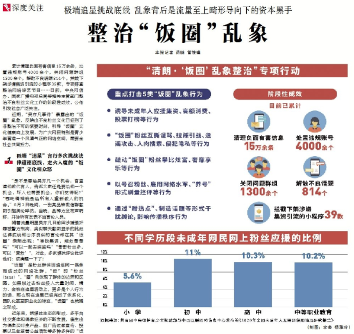 ●今天出版的中国纪检监察报深度关注栏目以《整治“饭圈”乱象》为题指出:“饭圈”乱象,反映出不良粉丝文化已经到了非整治不可的紧要时刻,引导“饭圈”文化健康向上发展,为广大网民特别是青少年营造一个风清气正的网络空间,需要全社会共同努力。