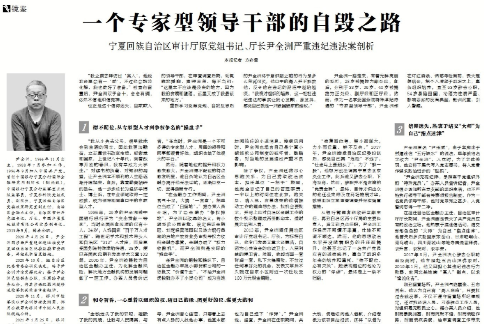 ●今天出版的中国纪检监察报以《一个专家型领导干部的自毁之路》为题,对宁夏回族自治区审计厅原党组书记、厅长尹全洲严重违纪违法案进行了全面剖析。
