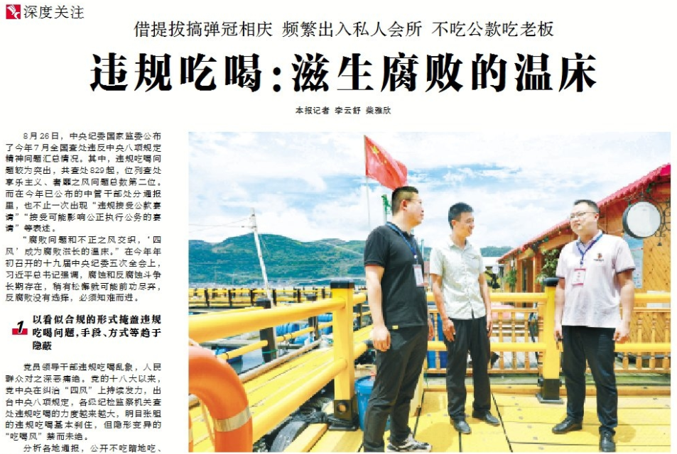 ●今天出版的中国纪检监察报深度关注栏目聚焦违规吃喝问题。文章指出:分析各地通报,公开不吃暗地吃、巧妙包装变相吃、本级不吃吃下级、不吃公款吃老板,是当前违规吃喝问题的突出表现。因而,对“舌尖上的腐败”,必须常抓不懈、露头就打,对违规吃喝隐形变异,更要保持高度警惕。
