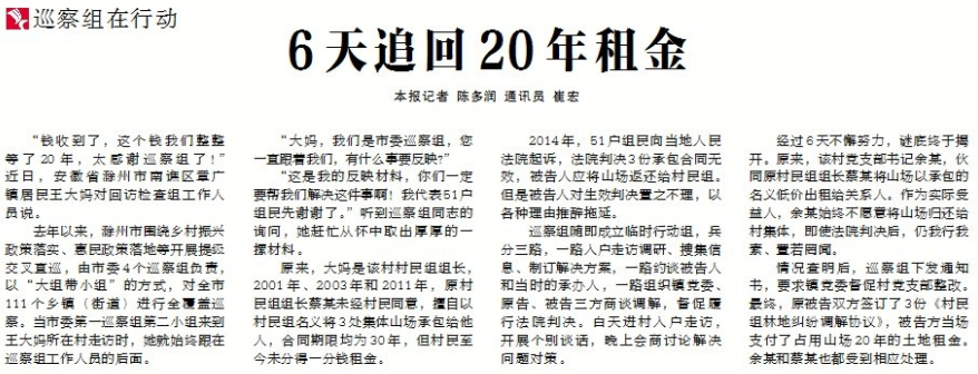 ●今天出版的中国纪检监察报以《6天追回20年租金》为题,报道了滁州市在开展提级交叉直巡中,发现一起村民组林地纠纷事件,市委巡察组一方面查清事实,一方面积极帮助协调解决,最终,帮助当地51户村民追回了占用山场20年的土地租金。
