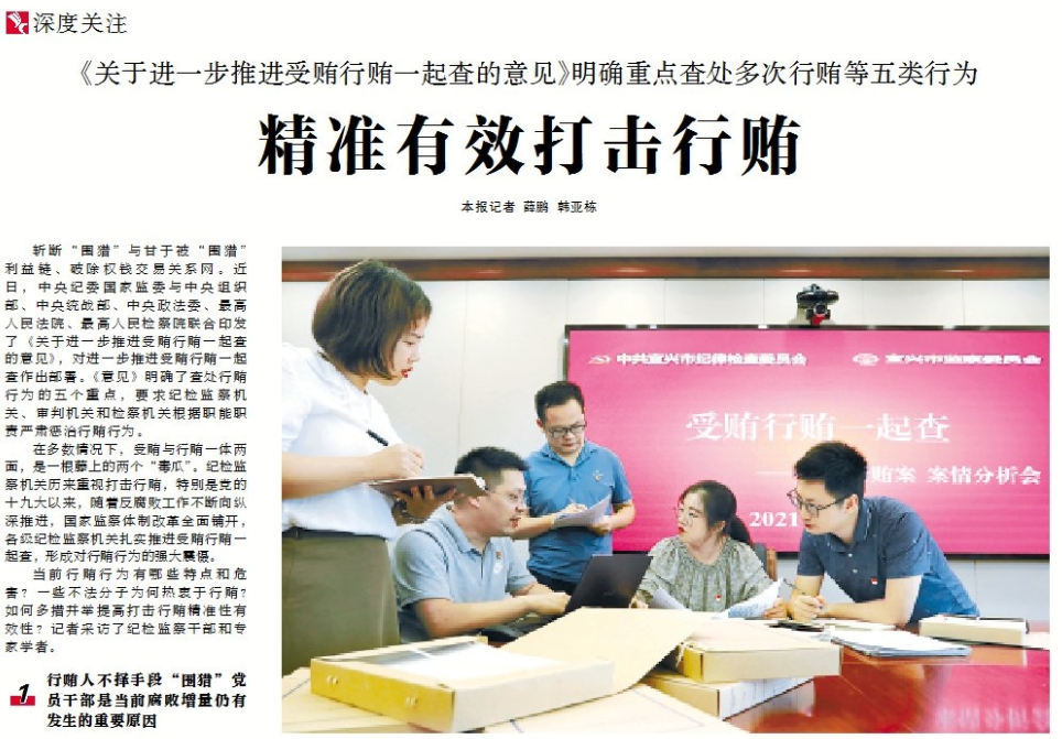 ●今天出版的中国纪检监察报深度关注栏目以《精准有效打击行贿》为题,就当前行贿行为有哪些特点和危害、一些不法分子为何热衷于行贿、如何多措并举提高打击行贿精准性有效性等问题,采访了纪检监察干部和有关专家学者进行深入分析。