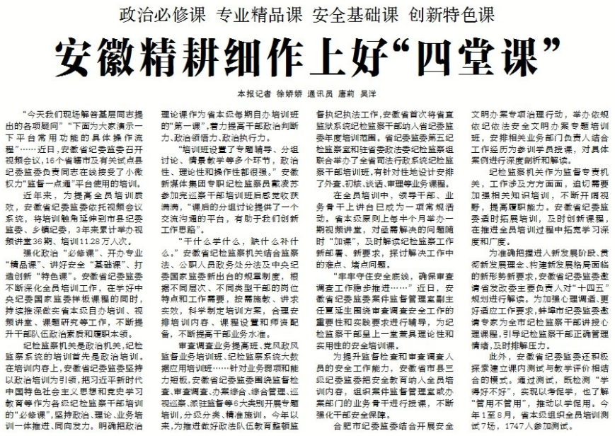 ●今天出版的中国纪检监察报发表文章《安徽精耕细作上好“四堂课”》。文章指出:强化政治“必修课”、开办专业“精品课”、讲好安全“基础课”、打造创新“特色课”。安徽省纪委监委不断深化全员培训工作,在学好中央纪委国家监委样板课程的同时,持续推深做实省本级自办培训、视频讲堂、课题研究等工作,不断提升干部队伍政治素质和履职本领。