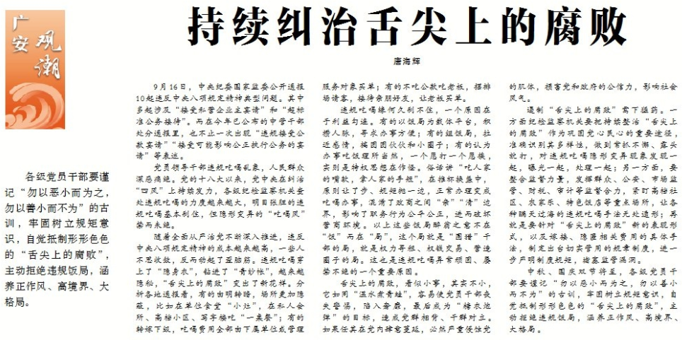●今天出版的中国纪检监察报广安观潮栏目发表评论《持续纠治舌尖上的腐败》。文章指出,各级党员干部要谨记“勿以恶小而为之,勿以善小而不为”的古训,牢固树立规矩意识,自觉抵制形形色色的“舌尖上的腐败”,主动拒绝违规饭局,涵养正作风、高境界、大格局。