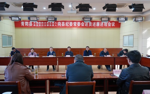 11月24日,青阳县纪委组织召开乡镇党政正职和县直单位主要负责人述责述廉述效会议,8名乡镇和县直单位党委(党组)书记现场向县纪委常委会述责述廉述效,接受提问和测评。会议邀请部分党代表、人大代表和政协委员列席,还邀请了部分监管服务对象参会,并现场对述责述廉述效对象进行测评打分。