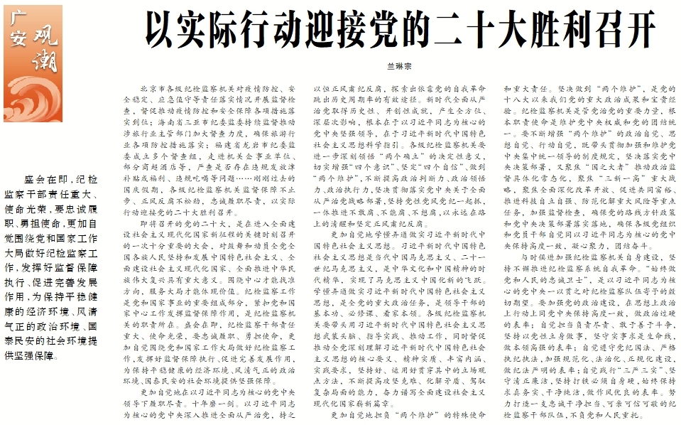 党的二十大即将召开,全面建设社会主义现代化国家,实现新时代新征程各项目标任务,关键在党。回望过去,党团结带领人民进行革命、建设、改革的实践都证明,什么时候我们党自身坚强有力,什么时候党和人民事业就能无往而不胜。面向未来,继续发扬彻底的自我革命精神,坚持不懈把全面从严治党向纵深推进,始终保持“赶考”的清醒,不断增强党的自我净化、自我完善、自我革新、自我提高能力,我们党就一定能永葆旺盛生命力和强大战斗力,团结带领人民战胜前进道路上的一切风险挑战,谱写全面建设社会主义现代化国家新篇章,夺取中国特色社会主义新胜利。