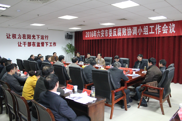 近日,六安市委反腐败协调小组召开工作会议,市委常委、市纪委书记、市委反腐败协调小组组长汪德满出席会议并讲话。副市长、市公安局长、市委反腐败协调小组副组长朱潘杰,市中级人民法院院长、市委反腐败协调小组副组长胡志刚,市人民检察院检察长、市委反腐败协调小组副组长杨开江参加会议。