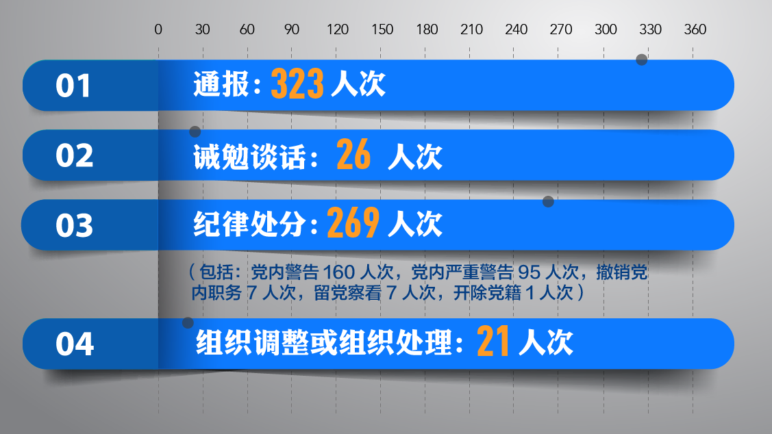 没有有效的追责手段,问责就等于失去了“牙齿”,毫无威慑力。各地在问责过程中,实践“监督执纪”四种形态,综合运用条例规定的方式方法开展问责。在通报的323人次中:诫勉谈话26人次;组织调整或组织处理21人次;纪律处分269人次,其中党内警告160人次,党内严重警告95人次,撤销党内职务7人次,留党察看7人次,开除党籍1人次。另外,在网站通报曝光均属于通报一类处理方式,共323人次。