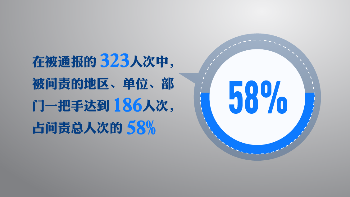 2012-2016年4年间,因单位多人违纪违法,北京市西城区环保局党组书记、局长被问责;2016年,因落实危房改造补助资金工作不力,贵州省盘县大山镇原党委书记被问责……在被通报的323人次中,被问责的地区、单位、部门一把手达到186人次,占问责总人次的58%。