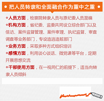 在监察体制改革上先行一步的北京、浙江、山西三地,把转隶作为推进试点工作的关键,坚持高标准,逐个审核转隶人员档案,严把政治关、严格资格条件,对不适合到纪委、监委工作的不予转隶。截至今年4月底,三个试点地区全面完成省、市、县监察委员会组建和转隶工作,并积累了一些好的经验和做法,其中就有下面这条。