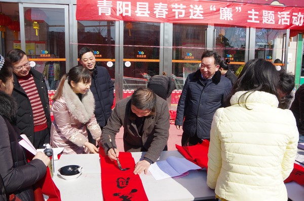 书法爱好者现场挥毫泼墨,义务为过往群众写春联、送祝福。