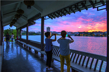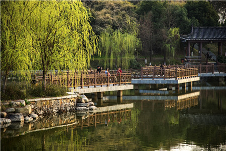 莲花湖公园是一个集休闲、娱乐、观光和公共健身功能于一体的开放式公园。游客漫步在莲花湖公园小路上,仿佛进入了山水画,时不时拿着手机记录下如诗如画的美景。